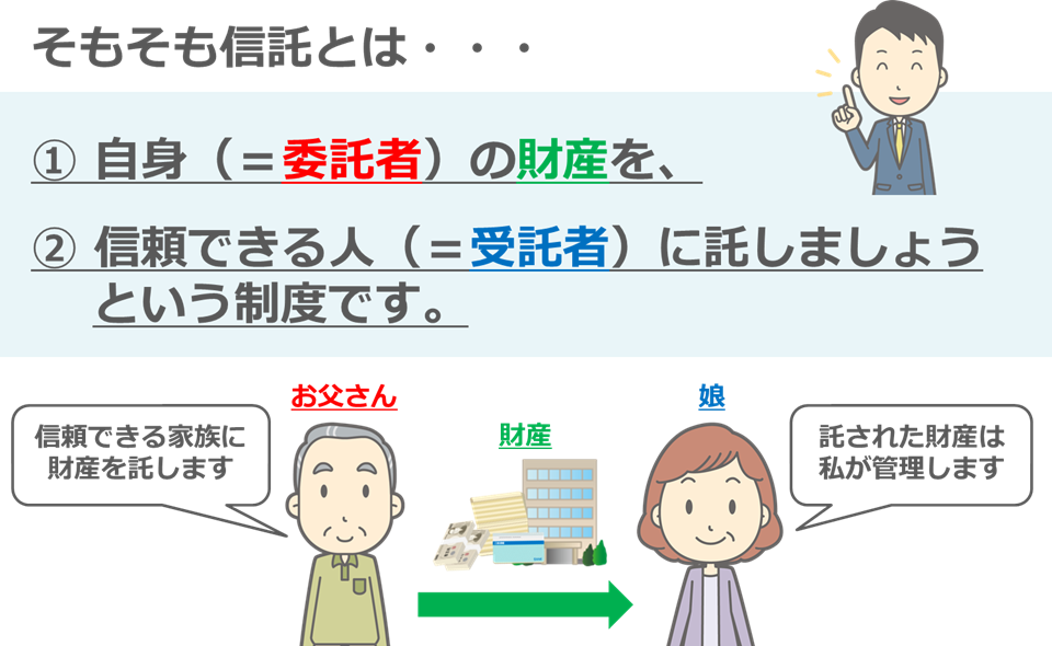 家族信託は、ある人の財産を、特定の利益を受ける人のために、信頼できる人に管理を託す方法です。そこで、これらの人たちを、「委託者」、「受託者」、「受益者」と呼びます。よく出てくる言葉ですので、おさえておきましょう。